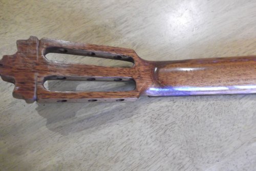 For example the head stock was broken off completely , , the stage lights fell on it while in the back of a lorry ....another long story ,,,,,,,. Anyway this is now repaired and pinned in , now it is actually the strongest part of the guitar.......... You can see that curve under the head stock which is the repair ...........